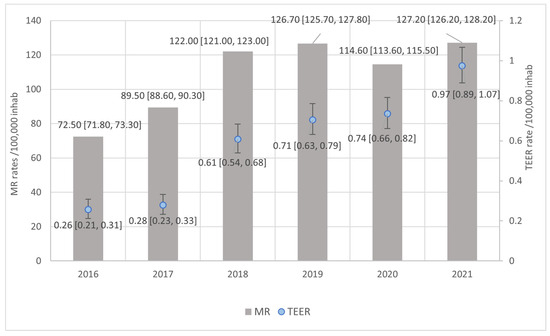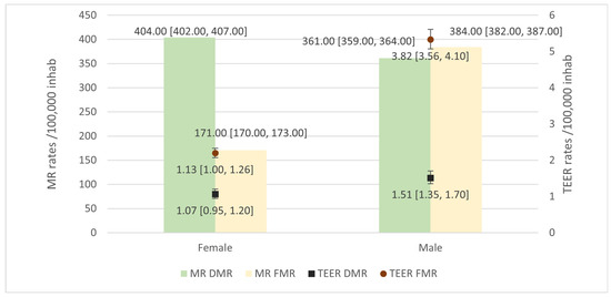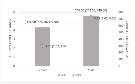 General DMR rates were higher than FMR rates, at 390.00 × 105 inhabitants [95%CI 388.00–392.00] and 265.00 × 105 inhabitants [95%CI 263.00–266.00], respectively. Patterns by sex showed a higher rate for women in DMR and higher for men in FMR (Figure 3). TEER utilization rates were higher for FMR at 2.33 × 105 inhabitants [95%CI 2.19–2.47] than for DMR at 1.27 × 105 inhabitants [95%CI 1.17–1.37]. Data by sex showed higher rates for men in TEER for both DMR and FMR.