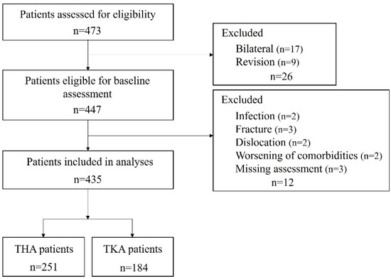 Patient enrollment flow diagram. Abbreviations: THA, total hip arthroplasty; TKA, total knee arthroplasty.