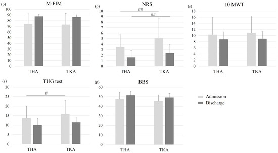 Performance on five outcome measures at admission and discharge for each group. Abbreviations: THA, total hip arthroplasty; TKA, total knee arthroplasty; M-FIM, motor component of the Functional Independence Measure; NRS, Numerical Rating Scale; 10 MWT, 10 M Walk Test; TUG, Timed Up and Go; BBS, Berg Balance Scale; p, points; s, seconds. # THA vs. TKA at admission (p = 0.004). ## THA vs. TKA at admission and discharge (p < 0.001).