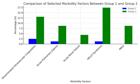 Maternal morbidity rates, as detailed in Table 2, were stratified according to the study groups. Among the eclamptic patients, 13.04% developed disseminated intravascular coagulation syndrome, compared to 2.46% in the preeclampsia group. Acute pulmonary edema was observed in 8.69% of the eclamptic patients, whereas it occurred in only 1.23% of the preeclampsia group. Acute renal failure was identified in a single case (4.34%) within the eclamptic group. HELLP syndrome was present in 17.39% of eclamptic patients, compared to 1.23% in the preeclampsia group. Posterior reversible encephalopathy syndrome (PRES) was detected exclusively in the eclamptic group, with an incidence of 8.69%. These data are graphically presented in Figure 2.