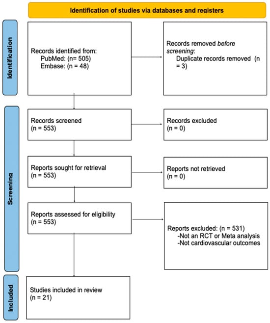 This scoping review aimed to map the available evidence on Finerenone’s impact on cardiovascular health by including randomized controlled trials (RCTs), post hoc analyses, and relevant meta-analyses. We conducted a comprehensive search using the term “Finerenone” without time constraints across the PubMed, Embase, and Cochrane Library databases. We followed PRISMA guidelines and the methodological framework by Arksey and O’Malley [5,6]. RCTs and post hoc analyses were included if they assessed Finerenone’s cardiovascular effects. Meta-analyses were considered if they included eligible RCTs and reported cardiovascular outcomes. No language restrictions were applied. Data were charted to capture the study characteristics, interventions, and key outcomes and synthesized narratively. The quality of the studies was assessed through a discussion of their strengths and limitations rather than through formal quantitative analyses such as risk of bias or heterogeneity assessments. This approach provided an overview of the evidence landscape relevant to Finerenone and cardiovascular health (Figure 1).