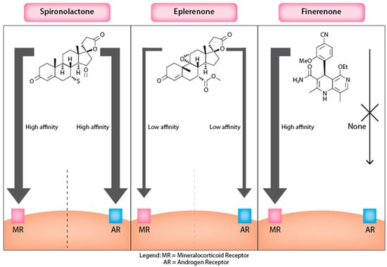 MRAs exhibit diuretic and antihypertensive effects by competitively inhibiting aldosterone at mineralocorticoid receptors in the heart, kidneys, and blood vessels. Spironolactone is a nonselective MRA that not only binds to mineralocorticoid receptors but also to androgen and progesterone receptors (Figure 2). Aldosterone, part of the renin-angiotensin–aldosterone system, acts on the distal tubules and collecting ducts, promoting sodium reabsorption and potassium secretion, and increasing vascular stiffness, cardiac inflammation, fibrosis, and remodeling. Blocking these actions helps reduce the harmful effects of aldosterone that can worsen HFrEF [7,8]. MRAs also help maintain serum potassium levels by decreasing urinary potassium loss, lowering the risk of hypokalemia and related arrhythmias associated with non-potassium-sparing diuretics [9,10,11]. They are primarily used in treating heart failure, particularly HFrEF, and have shown benefits in reducing morbidity and mortality when used alongside standard therapies like angiotensin-converting enzyme inhibitors (ACEis) or angiotensin receptor blockers (ARBs) [10,11,12]. The 2017 ACC heart failure guidelines recommend spironolactone for NYHA class II-IV HFrEF patients with a creatinine clearance above 30 mL/min and serum potassium below 5 mEq/L, and they suggest potential benefits for select heart failure with preserved ejection fraction (HFpEF) patients in reducing hospitalizations [1]. However, the use of spironolactone does not come without side effects. Its use can lead to hyperkalemia and impaired renal function, requiring close monitoring of serum potassium levels and kidney function [13]. Despite this, the Effect of Spironolactone on Morbidity and Mortality in Patients with Severe Heart Failure (RALES) trial, the Eplerenone, a Selective Aldosterone Blocker, in Patients with Left Ventricular Dysfunction after Myocardial Infarction (EPHESUS) trial, and the Eplerenone in Patients with Systolic Heart Failure and Mild Symptoms (EMPHASIS-HF) trial have demonstrated the efficacy of MRAs in HFrEF patients being treated with ACE inhibitors. This is likely due to their ability to address aldosterone escape and to reduce aldosterone effects that ACE inhibitors alone cannot manage [9,11,14,15]. Furthermore, spironolactone exhibits anti-androgenic effects due to its activity as a progesterone receptor agonist and androgen receptor antagonist, which can result in gynecomastia, breast tenderness, menstrual irregularities, impotence, and decreased libido, especially at higher doses [3,4]. Hence, it is an off-label, non-Food and Drug Administration (FDA)-approved medication for the treatment of hirsutism and acne vulgaris [16].