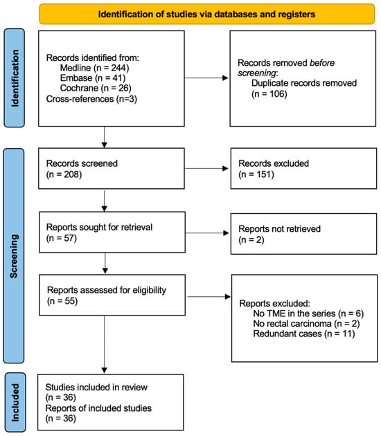 The initial database search identified a total of 314 studies, of which 106 were duplicates. After screening the titles and abstracts of the 208 remaining articles, 151 were excluded due to the non-relevant specialty or intervention. Two articles could not be retrieved despite an in-depth search that included contacting the corresponding authors. After a full-text review of the 55 eligible articles, an additional 19 were excluded: 11 were redundant cases included in larger and more recent papers, 6 were not related to TME, and 2 were not focused on rectal adenocarcinoma. Ultimately, 36 studies met the inclusion criteria and were selected for the qualitative synthesis of the literature (Figure 1).
