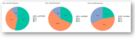 A 2 mL sample of peripheral blood was collected for genetic analysis. Genomic DNA extraction was performed following the instructions provided by the MagCore Nucleic Acid Extraction Kit (RBC Bioscience, New Taipei City, Taiwan). The DNA was preserved at −20 degrees Celsius. The concentration of DNA was measured using the Epoch Microplate Spectrophotometer (Agilent BioTek EPOCHSN, Santa Clara, CA, USA). For this study, one variant (rs4680) of the COMT gene and two variants (rs35753505 and rs3924999) of the NRG1 genes were selected for examination. TaqMan Drug Metabolism Genotyping Assays (Applied Biosystems Assay ID: C__25746809_50, ID: C____216209_50, ID: C____359159_10) and TaqMan Genotyping Master Mix (Applied Biosystems, Foster City, CA, USA) were utilized according to the manufacturer’s protocol. Purified DNA was amplified via real-time polymerase chain reaction (PCR) on the LightCycler 480 (Roche, Basel, Switzerland). Gene Scanning software version 1.5.1 (Roche) was employed. The genotyping process was conducted in a double-blind manner by two laboratory personnel. For quality control, 5% of the samples were selected randomly. The genotyping of ten samples was repeated with 100% reproducibility. Patients were categorized based on the genotype, as follows: for COMT rs4680, the genotypes were AA, AG, and GG; for NRG1 rs35753505, the genotypes were CC, CT, and TT; for NRG1 rs3924999, the genotypes were AA, AG, and GG.