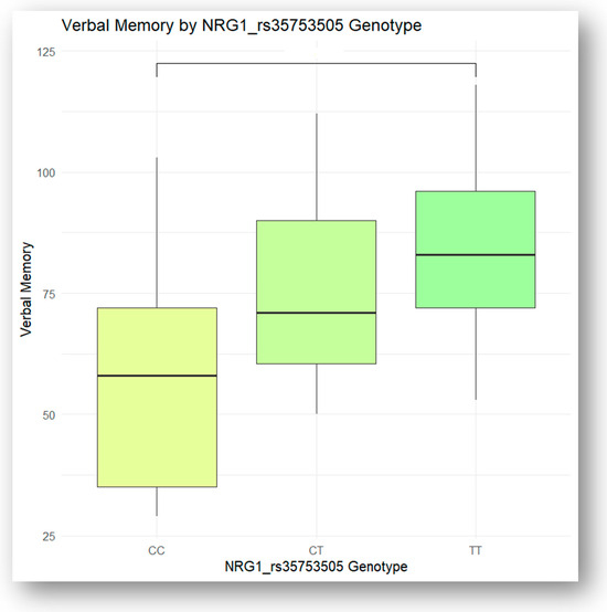 58]. This suggests that individuals with the TT genotype may have a cognitive advantage in verbal memory, which could have implications for cognitive rehabilitation strategies in schizophrenia. Interestingly, the existing literature suggests that the NRG1 rs35753505 genotype modulates brain activation during episodic memory tasks, with CC genotype carriers exhibiting hyperactivation in several brain areas involved in encoding and retrieval processes [
