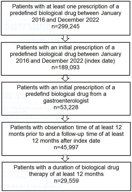 The patient selection process is displayed in Figure 1. All patients irrespective of age, who received a biologic therapy prescription (infliximab, adalimumab, golimumab, vedolizumab, or ustekinumab) between 1 January 2016 and 31 December 2022 from a gastroenterologist were selected from the LRx database for analysis. The date of the first prescription was used as the index date. Patients had to be observable in the database at least 12 months prior to and post the index date and were required to be on biologic therapy for at least 12 months.