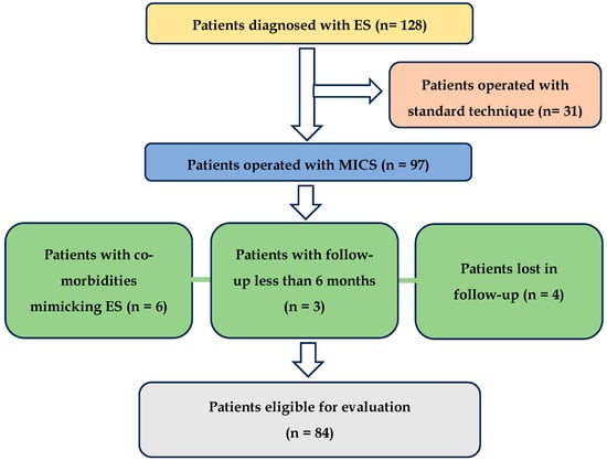 In the study, 128 patients were initially identified, with 97 undergoing MICS surgery. The remaining patients underwent styloid process resection to address vascular issues such as carotid artery dissection or jugular vein stenosis. This was performed via a wider neck approach to improve visibility, protect the neck vessels, and facilitate delicate piezosurgical or diamond burr resection, thereby minimizing the risk of damage to the vein or artery walls. Patients who underwent MICS and presented with head and neck conditions that could mimic the symptoms of elongated styloid process syndrome—such as Kimmerle anomaly, temporomandibular joint disorders (TMDs), and degenerative disk disease, as well as migraines, trigeminal, sphenopalatine, and glossopharyngeal neuralgia unresolved by conservative treatment—were excluded from the study. Individuals who did not return for further outpatient evaluation (lost to follow-up) were also excluded. After applying the inclusion and exclusion criteria, 84 patients were deemed eligible for the study, as illustrated in the flowchart (