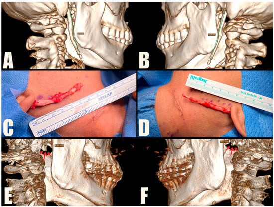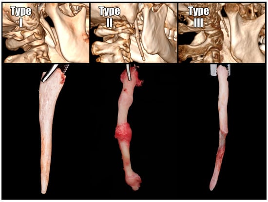 https://www.radiantviewer.com, accessed on 25 September 2024. Measurements were conducted in multi-planar reconstructions (MPRs) and 3D reconstructions to identify the plane that was ideally parallel to the bone’s projection. When the stylohyoid ligament exhibited segmental calcification, the entire length of the stylohyoid chain, extending from the base of the skull, was measured. Operated SPs were classified according to the Langlais classification, which categorizes them based on their structural characteristics [