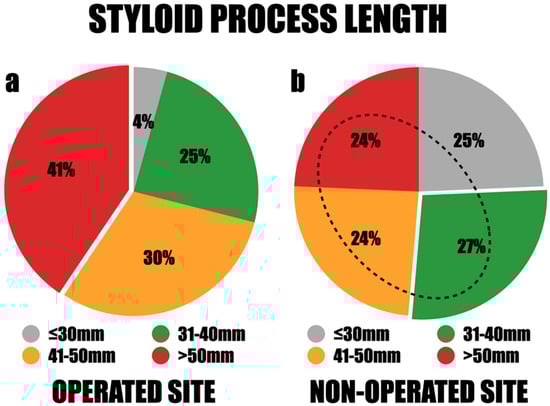 Figure 6a). There were no significant differences in length observed between males and females, between both sides, among different age groups, and across various BMI values of the patients. The mean length of the styloid processes was 49.3 mm on the right side and 47.6 mm on the left side. Notably, in all cases where styloid processes were removed bilaterally, the lengths exceeded 40 mm.