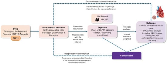 The flowchart depicts a two-sample randomization analysis assessing the impact of glucagon-like peptide-1 receptor agonism on the risk of aortic valve stenosis. The following key assumptions were rigorously evaluated: (i) the relevance assumption, ensuring that the selected genetic variants are indeed associated with the specified risk factor; (ii) the independence assumption, which posits the absence of unmeasured confounders that could affect the relationship between the genetic variants and the outcome; and (iii) the exclusion restriction assumption, which requires that the genetic variants influence the outcome exclusively through their effect on the risk factor of interest. Single nucleotide polymorphisms (SNPs) associated with GLP-1 receptor (GLP-1R) agonists were used as instrumental variables for a two-sample Mendelian randomization (MR) analysis. Genome-wide significant variants (p < 5 × 10−8) in the GLP-1 receptor gene were selected, excluding those with linkage (r2 < 0.1). These variants were linked to type 2 diabetes risk and glycated hemoglobin levels (HbA1c). The main analysis employed inverse variance weighting (IVW), with additional methods (weighted median, MR-Egger) to test robustness and check for pleiotropy.