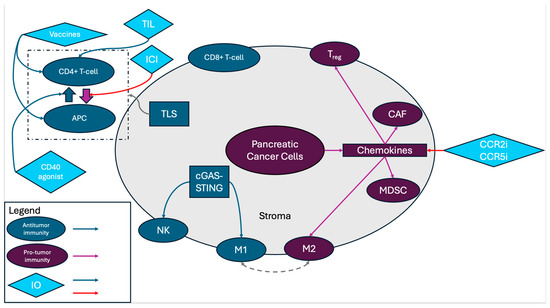 Schematic summarizing the key components of the tumor microenvironment and where immune therapies act within these pathways. Blue arrows from immune-oncology (IO) agents represent agonism whereas red arrows from IO agents represent antagonism. APC, antigen-presenting cell; TILs, tumor-infiltrating lymphocytes; ICIs, immune checkpoint inhibitors; TLSs, tertiary lymphoid structures; NK, natural killer cells; cGAS-STING, cyclic GMP-AMP synthase and Stimulator of Interferon Genes; M1, tumor-associated macrophage type 1; M2, tumor-associated macrophage type 2; Treg, regulatory T-cell; CAF, cancer-associated fibroblast; MDSC, myeloid-derived suppressor cells; CCR2i, CCR2 inhibitor; and CCR5i, CCR5 inhibitor.