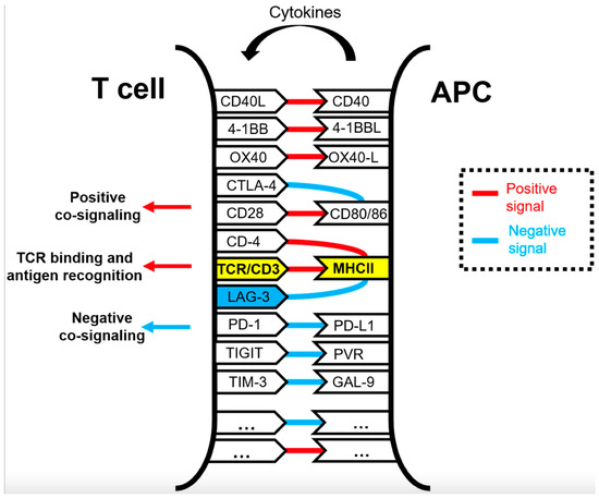 Immune checkpoints (red) and costimulatory (blue) interactions between antigen presenting cells and T-cells. Adopted from Chocarro et al., 2021 (open access) [88].