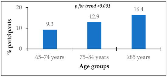 This study included 4308 patients (30% men) aged 65–107 years. The majority of participants (60%) were examined in an outpatient setting, 20% were examined in a hospital, 19% were examined at home, and 1% were examined in residential institutions/assisted-living facilities. The main demographic, anthropometric, and subjects’ clinical characteristics according to age groups were presented previously [12].