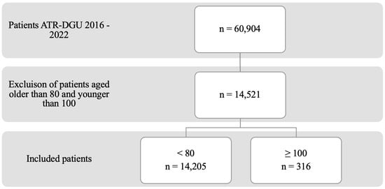 Hip fractures are a leading cause of hospitalization among older patients. Due to demographic changes, a significant increase in the number of individuals (centenarians) who reach their 100th birthday has started to occur. Since 1950, the global number of centenarians has nearly doubled every decade [1,2]. Because of this increase, the global number of centenarians is predicted to reach more than 25 million by 2100 and the total number of hip fractures is projected to double in nearly all European countries up to 2050 [3]. About 40% of these patients will be older than 85 years [4]. The incidence of hip fractures increases exponentially with age, but data concerning very old patients are often pooled so that information about the incidence in over-100-year-olds is rare [4,5]. An observational study from the Spanish National Surveillance System for Hospital Data showed a hip fracture incidence of 3.8% in centenarians in 2005, and data from Denmark showed an incidence of 4.7% [6,7]. A recent meta-analysis stated that the current evidence base regarding outcomes in centenarians is of moderate to low quality [8]. Age is a known risk factor for early mortality in hip fracture patients and has become a parameter that has been incorporated into many mortality predictions models, such as the Geriatric at Risk Score (GeRi-Score) [9,10]. Besides medical issues, ethical dilemmas about the proper way of treating centenarians are also discussed [11]. On the other hand, centenarians are described as the lowest complexity patients with the lowest Charlson Co-morbidity Index (CCI) compared to younger hip fracture patients [12] and their comparatively healthy aging process is based on their genetic signature [13]. It is widely known that orthogeriatric care has led to a decrease in in-house mortality [14]. Relatively little is known about the oldest of the old despite their increasing numbers and the growing interest in this population. We conducted this study to analyze mortality in this remarkable population compared to the under 80-year-old patients group in certified centers for geriatric trauma.