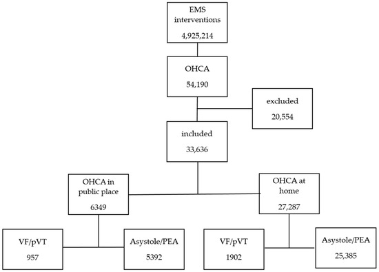 From the available database of 4,925,214 EMS calls, 54,190 patients with a diagnosis of cardiac arrest (ICD I10-I46) who received CPR at the scene were selected. Patients who had suffered OHCA as a result of suicide attempt, crime, trauma, etc., who had died before the arrival of EMS, and who had no information in their medical records about the initial rhythm of OHCA were then excluded from the study. Finally, data from 33,636 patients were analyzed (Figure 1). Patients were divided based on the occurrence of OHCA in public and non-public places. In this study, “public places” were defined as non-residential locations, including open public areas such as parks, streets, and public transportation stations, as well as workplaces, commercial areas, and other non-residential settings. “At-home” or “non-public places” referred exclusively to private residences. Data such as sex, age, comorbidities (hypertension (HT), diabetes mellitus (DM), heart failure (HF), obesity), and history of acute coronary syndrome (ACS) and stroke were analyzed.