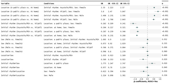 The male vs. female difference in odds for ROSC was significant only in the case of individuals of the VF/pVT CA mechanism undergoing an emergency in a public place (male vs. female OR = 0.566, p ≈ 0.008). This occurrence resulted in significant two-way differences (interactions) based on the CA mechanism or emergency location.