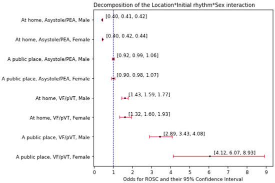 A full logistic regression model with effects and interactions reveals a three-way, multivariate simultaneous modulation of odds for ROSC by sex, incidence location, and initial rhythm (location × initial rhythm × sex, p ≈ 0.017, Table S4). The model was decomposed into lower-dimensional effects, which are shown in Figure 2 and Figure 3. Odds ratios and their changes upon different conditions are shown in Figure 2. Estimated odds (components of the aforementioned ORs) and their conditional change are shown in Figure 3. The interaction has been analyzed in three possible ways, as featured in the next subsections.