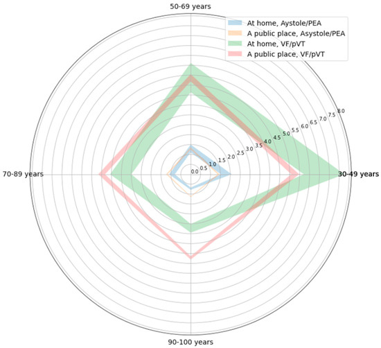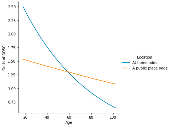 The above-mentioned difference in how age affected the odds of ROSC depending on location was analyzed with the use of a model featuring interactions (Table S5). Based on this, it could be stated that the initial rhythm does not significantly affect the way both location and age modulate the odds of ROSC (p ≈ 0.372). Thus, the baseline odds of ROSC, although differing by 3.746-fold (VF/pVT vs. asystole/PEA), would change in the same pattern, depending on location and age. This pattern, depicted for the asystole/PEA rhythm, is shown in Figure 4.