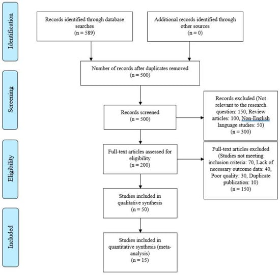 Preferred Reporting Items for Systematic Reviews and Meta-Analyses (PRISMA) 2009 flowchart for data collection after finding suitable studies. Entering the search criteria into the Embase, CENTRAL, and MEDLINE/PubMed search engines yielded a total of 589 studies for the period ending 31 March 2024. A critical review of these published studies identified 15 studies that met the inclusion criteria for the present meta-analysis.
