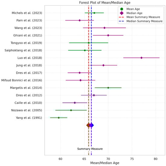 Forest plot of age analysis: This forest plot displays the mean and median ages from selected studies, differentiated by green (mean age) and purple (median age) markers. Summary measures are shown at the bottom: a red diamond for the overall mean and a blue diamond for the overall median, underlined by matching dashed lines [10,11,12,13,14,15,16,17,18,19,20,21,22,23,24].