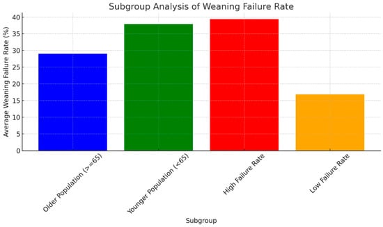 The figure above presents the subgroup analysis of weaning failure rates, comparing older (≥65 years) versus younger (<65 years) populations, as well as studies with high versus low weaning failure rates, based on the overall average.