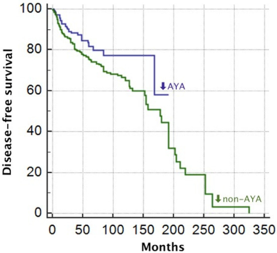 Regarding survival analysis, we found a higher DFS in AYA (152 months) compared to non-AYA (149 months), confirming the data from the literature [3], although in contrast to some reports that found a worse DFS in AYA patients [5,6]. Most likely, the better DFS observed in AYA patients may be related to the fact that often young patients usually have fewer comorbidities and a stronger overall health status, as well as young patients tend to have a more robust immune system. All of these considerations could impact the DFS we observed in our case series.