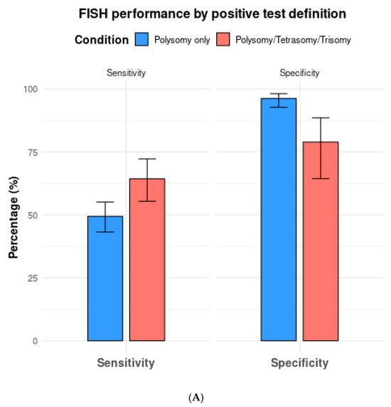 (A) Comparison of fluorescence in situ hybridization (FISH) performance based on positive test definitions of polysomy only vs. polysomy/tetrasomy/trisomy. (B) Comparison of fluorescence in situ hybridization (FISH) performance based on the positive test definitions of polysomy only vs. polysomy/9p deletion.