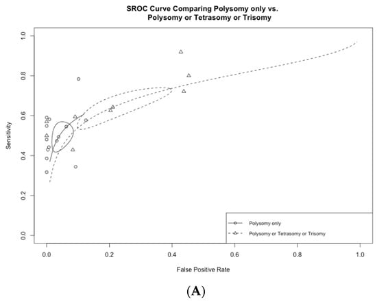 Among the 13 studies utilizing FISH polysomy as the threshold for diagnostic FISH, the overall test sensitivity was 49.4% (95% CI 43.2–55.5%), with a specificity of 96.2% (95% CI 92.7–98.1%) (Figure 4). The overall AUC was 0.74 (95% CI 0.72–0.76) (Figure 5A). On the other hand, in studies that considered polysomy, tetrasomy, or trisomy as positive FISH (n = 8), the overall sensitivity increased significantly (64.3%, 95% CI 55.4–72.2%) (Figure 4A). However, this increase in sensitivity was accompanied by a significant drop in specificity to 78.9% (95% CI 64.4–88.5%), with an overall AUC of 0.74 (95% CI 0.71–0.77).