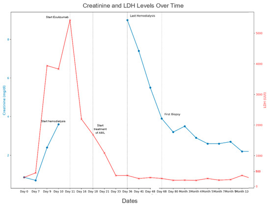 At the time of diagnosis, plasma exchange was considered for treatment, as it has traditionally been the standard initial approach for secondary HUS. However, the severity of the patient’s condition, coupled with a paradigm shift in the management of HUS, led to a consensus with the hematology team that early initiation of eculizumab was the most appropriate course of action. She was started on eculizumab 900 mg per week for 4 weeks, along with antibiotic prophylaxis with amoxicillin and the required vaccination. Following the introduction of eculizumab, the hemolysis stabilized within one week, enabling the initiation of leukemia treatment the subsequent week (Figure 1). Given the patient’s situation, she was not a candidate for intensive chemotherapy, and it was decided to treat the AML with the regimen for unfit patients (azacitidine and venetoclax). The patient showed progressive improvement in hemolysis and diuresis recovery with permanent discontinuation of hemodialysis one month after the onset of symptoms. The first bone marrow analysis showed complete remission of AML three months after chemotherapy initiation.