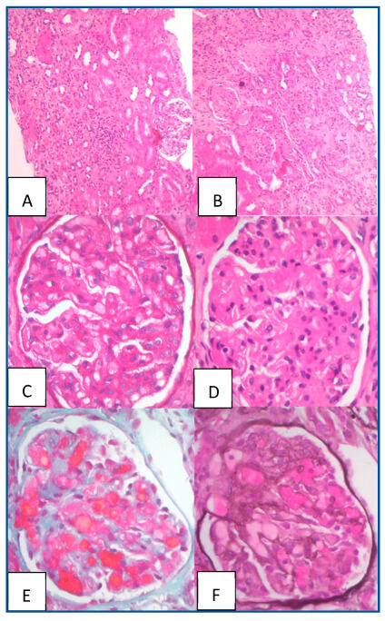 Pathological anatomy of the first renal biopsy with signs of TMA. Images (A,B) with hematoxylin and eosin and PAS staining: Interstitial fibrosis of 40% of the cortical tissue associated with tubular atrophy and a mild chronic inflammatory infiltrate. Images (C,D): Ectasia and capillary congestion, associated with focal mesangiolysis. Images (E,F) with Masson trichrome and silver staining: Highlight the ectasia and capillary congestion.