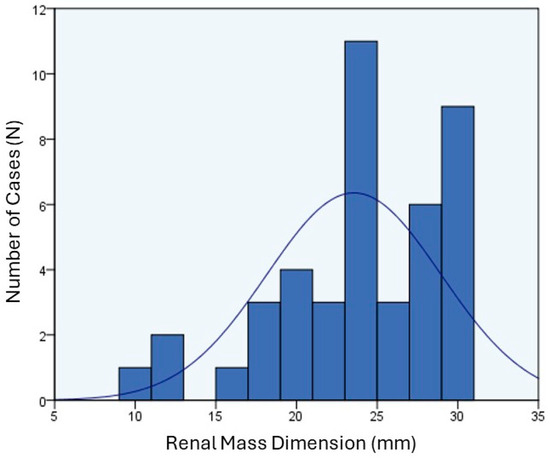 Our radiologist encountered differentiation challenges between atypical angiomyolipoma and oncocytomas in only two cases. We specifically analyzed lesions measuring 30 mm or smaller. The chart illustrates the graphical distribution of lesion sizes in millimeters, with a mean of 23.56 mm, standard deviation of 5.40, and a median of 24 mm (Figure 2).