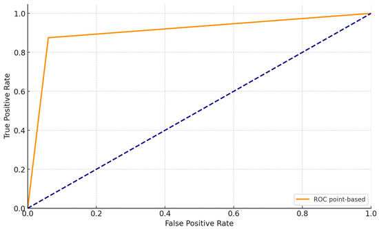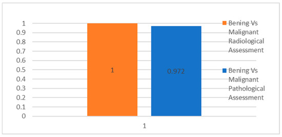 Our analysis yielded significant findings despite the relatively small sample size of 43 subjects. Sensitivity, specificity, positive predictive value, and negative predictive value were computed comparing patients with the illness to non-ill patients (controls) based on the results of diagnostic tests, yielding the following results: sensitivity of 0.875, positive predictive value of 0.95, specificity of 0.94, and negative predictive value of 0.86. A ROC curve was generated comparing biopsy results (healthy individuals labeled as 0 and sick individuals as 1) and distinguishing between benign and non-benign cases. The test proved highly informative, particularly due to its high sensitivity (Figure 3).