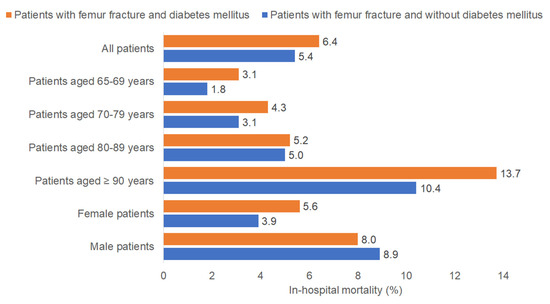 Figure 2 shows the rate of in-hospital mortality in older patients with femur fracture with and without DM. The overall in-hospital mortality rate was higher in patients with DM (6.4%) than in those without DM (5.4%). The in-hospital mortality after femur fracture increased with age. In patients aged 65–69 years, the in-hospital mortality after femur fracture was 3.1% for patients with DM and 1.8% for those without DM. In patients aged 70–79 years, the in-hospital mortality after femur fracture was 4.3% for patients with DM and 3.1% for those without DM. In patients aged 80–89 years, the in-hospital mortality rates were similar for DM (5.2%) and non-DM (5.0%) patients. The highest rate of in-hospital mortality was found in patients over 90 years of age, who also showed the largest difference between the groups (13.7% with DM vs. 10.4% without DM). Female patients had a higher in-hospital mortality rate after femur fracture among patients with DM (5.6%) compared to those without DM (3.9%). By contrast, there was no major difference in the in-hospital mortality after femur fracture in male patients (8.0% with DM vs. 8.9% without DM). However, the differences displayed in Figure 2 are descriptive and univariable and do not take into account the impact of co-diagnoses.