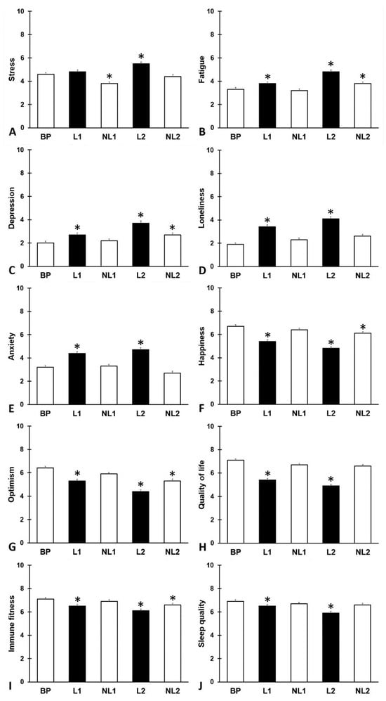 Mood assessments. Mean and standard error are shown for (A) stress, (B) fatigue, (C) depression, (D) loneliness, (E) anxiety, (F) happiness, (G) optimism, (H) quality of life, (I) immune fitness, and (J) sleep quality. Abbreviations: BP = before the pandemic, L1 = lockdown 1, NL1 = no lockdown 1, L2 = lockdown 2, NL2 = no lockdown 2, COVID-19 = coronavirus disease 2019. Significant differences from ‘before the pandemic’ (p < 0.0125) are indicated by *.