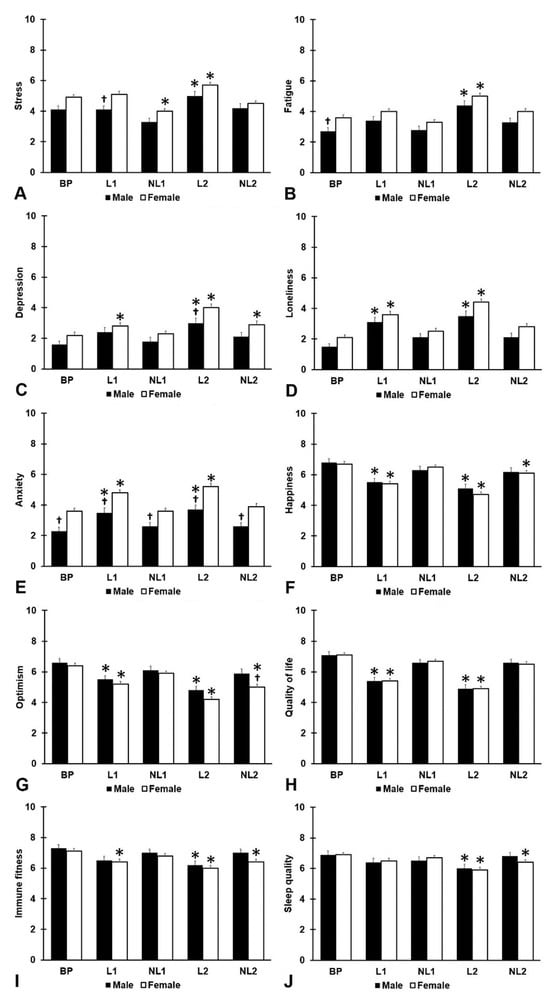 Mood assessments according to sex. Mean and standard error are shown for (A) stress, (B) fatigue, (C) depression, (D) loneliness, (E) anxiety, (F) happiness, (G) optimism, (H) quality of life, (I) immune fitness, and (J) sleep quality. Abbreviations: BP = before the pandemic, L1 = lockdown 1, NL1 = no lockdown 1, L2 = lockdown 2, NL2 = no lockdown 2, COVID-19 = coronavirus disease 2019. Significant differences from ‘before the pandemic’ (p < 0.0125) are indicated by *. Significant differences between men and women (p < 0.010, after Bonferroni’s correction) are indicated by †.