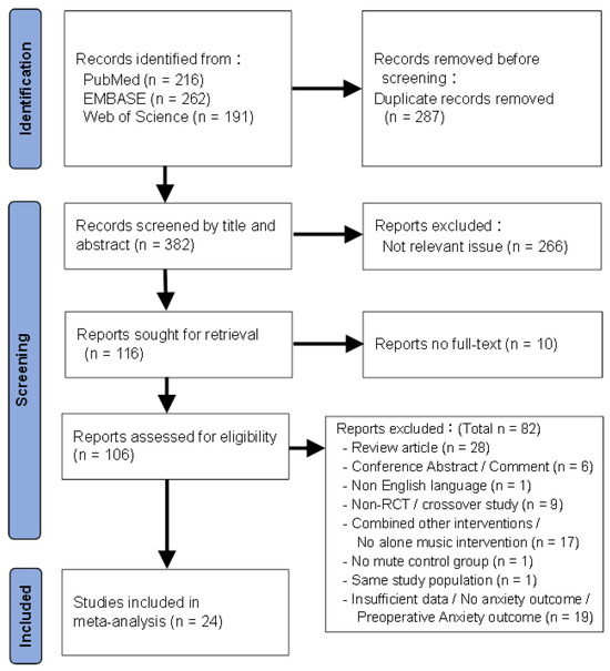 Two authors, K.-C. Shih and J.-L. Yang, independently searched three popular electronic databases (PubMed, Web of Science, and Embase) for clinical trials on the impact of music distraction on dental anxiety from the inception date to May 2024. They also searched for relevant review articles for further studies. The search terms used were “music” and “dental anxiety”. In PubMed, the search strings included (music OR song OR audio) AND (dental OR tooth) AND (anxiety).