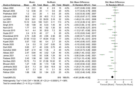 The modified Jadad scores for the methodological quality assessment of each selected study are illustrated in Table 2. Almost all studies did not have a double-blind design. Moreover, no studies assessed adverse effects of music intervention. Nine studies had low quality [23,24,25,26,28,29,32,34,35], and fifteen studies had moderate quality [22,27,30,31,33,36,37,38,39,40,41,42,43,44,45]. The average score of the included twenty-four studies was 4.1, which indicated overall moderate quality. We also utilized the Cochrane risk-of-bias tool to assess the risk of bias for all included studies (Supplementary Figure S1).