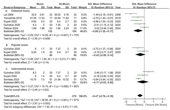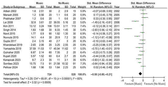 All statistical analyses and meta-analyses were conducted using Review Manager 5 software (version 5.4, The Nordic Cochrane Center, Copenhagen, Denmark). Pooled effect estimates (ESs) were calculated by determining the standard mean difference (SMD) in outcomes for continuous variables, along with their respective 95% confidence intervals (CIs). Values less than zero indicated more effective outcomes in the music group. A p-value of less than 0.05 was considered significant for the analysis of ESs. Heterogeneity was assessed using I-square statistics (I2), with an I2 over 50% indicating substantial heterogeneity [19]. The random-effects model was used to estimate the pooled ESs. In studies with multiple music groups, groups were combined to create a single pair-wise comparison, or the “shared” group was split into two or more groups with smaller sample sizes [20].