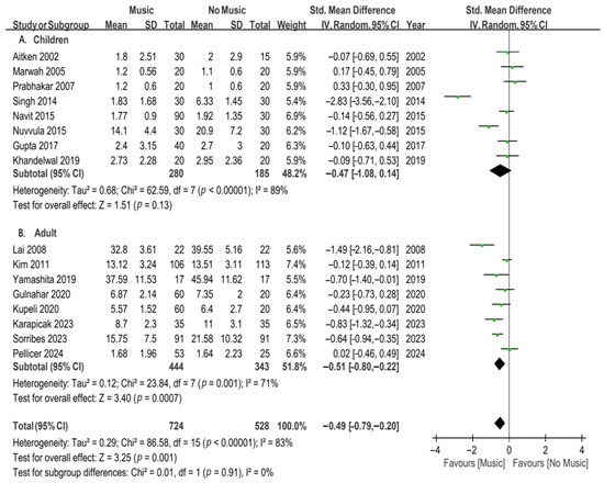 The subgroup analysis was conducted based on age groups for participants undergoing invasive procedures under local anesthesia (Figure 4). Eight studies were included to analyze the impact of music on children. The results of the subgroup analysis indicated that music intervention did not significantly improve dental anxiety in children (SMD, −0.47; 95% CI, from −1.08 to 0.14; p = 0.13; I2 = 89%). Eight studies were included to analyze the effect of music on adults. The results of the subgroup analysis showed a significant reduction in dental anxiety among adults with music intervention (SMD, −0.51; 95% CI, from −0.80 to −0.22; p = 0.0007), but with substantial heterogeneity (I2 = 71%). A music intervention was found to improve dental anxiety in adults undergoing invasive procedures under local anesthesia.