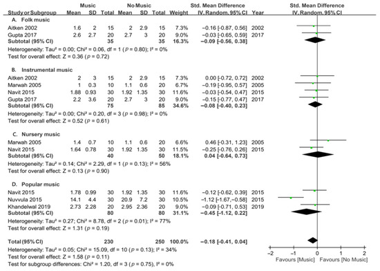 Another subgroup analysis was conducted to investigate the therapeutic impact of music intervention on dental anxiety in pediatric participants undergoing invasive procedures under local anesthesia, focusing on various music genres. The analyses included four music genres: folk music, instrumental music, nursery music, and popular music (Figure 6). The results of the subgroup analyses revealed that none of the music genres significantly reduced dental anxiety in children: folk music in two studies (SMD, −0.09; p = 0.72); instrumental music in four studies (SMD, −0.08; p = 0.61); nursery music in two studies (SMD, −0.04; p = 0.90); and popular music in three studies (SMD, −0.45; p = 0.19). These findings suggest that differences in music genres had no specific impact on alleviating dental anxiety in pediatric participants undergoing invasive procedures under local anesthesia.