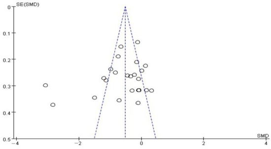 The symmetry of the funnel plot of standard errors by SMD was assessed, and the results are depicted in Figure 8. The results revealed a symmetrical distribution of the funnel plot, indicating no publication bias in the 24 studies based on dental anxiety assessment [46]. The funnel plots for each outcome are presented in Supplementary Figure S2.