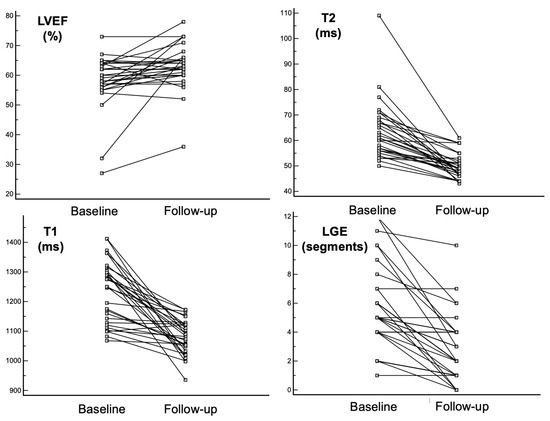 The disease course was favorable in all patients with complete clinical recovery. At the time of the second CMR, none of them complained of any symptoms or had any ECG changes or elevated cardiac or inflammatory markers. There was a significant improvement in their left ventricular ejection fraction (LVEF), T1 and T2 times, and a number of segments showing edema (T2W) and late gadolinium enhancement (LGE), as presented in Table 2. Left ventricular end-diastolic volume did not change between the baseline and follow-up CMR. Individual changes in LVEF, T1 and T2 times, and LGE between the baseline and follow-up CMR are presented in Figure 1.