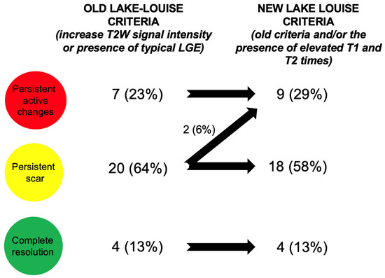 At baseline, all patients fulfilled both the old and new Lake Louise criteria. All of them presented with elevated T1 and T2 times on parametric imaging (>52 ms and >1086 ms, respectively) as well as an elevated T2W signal intensity ratio of the left ventricular myocardium to skeletal muscle ≥2.0 and the presence of late gadolinium enhancement. According to the old Lake Louise criteria, at follow-up, a complete resolution of changes was observed in only four patients (13%). Seven patients (23%) still presented active changes and the remaining twenty (64%) showed a persistent scar. When new Lake Louise criteria were applied, incorporating parametric imaging, an additional two patients (6%) were found to have persistent active changes as defined by their increased T2 times instead of a persistent scar. The patients’ status at follow-up and changes in disease activity status according to the old and new Lake Louise criteria are presented in Figure 2.