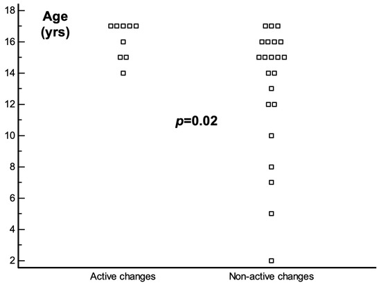 Finally, we have looked for predictors of persistent active changes in follow-up CMR. For this reason, we have combined patients with complete recovery or the presence of a persistent scar into one group (22 patients, 71%) and compared them to those with the presence of active inflammation according to the new Lake Louise criteria (9 patients, 29%). None of the parameters except the patient’s age was predictive of persistent active changes (Table 3). Interestingly, all three patients with heart failure at baseline were free from inflammation in their CMR at follow-up, but this was not significant. Patients with persistent changes were older than those who showed a cessation of inflammatory changes, as demonstrated in Figure 3. None of the patients below 14 years of age presented with persistent active changes at follow-up and all the patients who showed persistent inflammation were between 14 and 17 years old, with the majority of them being 17 years of age (56%).