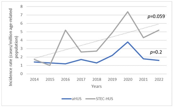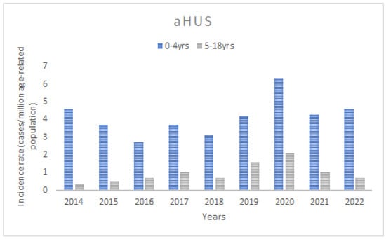 The average incidence for aHUS during the observed period was 1.8/marp, not significantly different from that previously reported for pediatric populations, 0.5–2/marp, although it was higher than that reported by Ardissino in Italy between 2002 and 2012 [2,12]. Only a slight variation in incidence was observed in Poland during the period evaluated. It should be noted that the presented incidence rates for both STEC-HUS and aHUS are based on current available diagnostic methods—microbiological and genetic—which greatly increase the likelihood of an accurate diagnosis. In contrast, earlier studies often relied primarily on observations of clinical symptoms, in the absence of other research methods. This is particularly relevant to the calculated incidence of aHUS, since for more than half of the children with this diagnosis in our study, one of the first symptoms found was diarrhoea, including bloody diarrhoea. Historically, without the microbiological confirmation of an STEC infection, these cases could misclassified as STEC-HUS, falsely underestimating the incidence of aHUS. An essential criterion for classifying a patient as aHUS in the Polish Pediatric HUS Registry was, among other things, the exclusion of an STEC infection through polymerase chain reaction for Shiga toxin genes or Shiga toxin antigens using enzyme immunoassay.