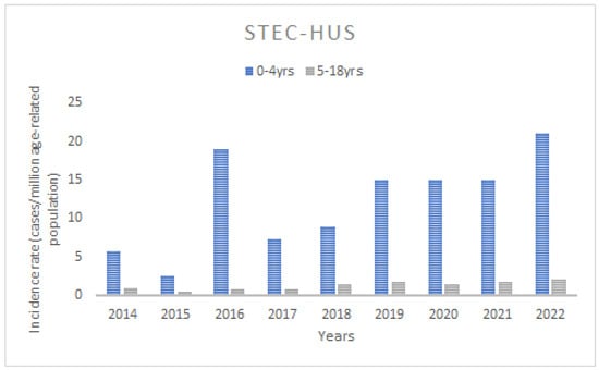 The annual incidence of the Shiga toxin-producing Escherichia coli-associated HUS (STEC-HUS) in the age groups of 0–4 years and 5–18 years.