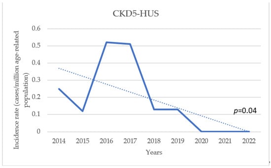 Trend in the annual incidence of chronic kidney disease stage 5 (CKD5) due to HUS (both aHUS and STEC-HUS) over the observation period.