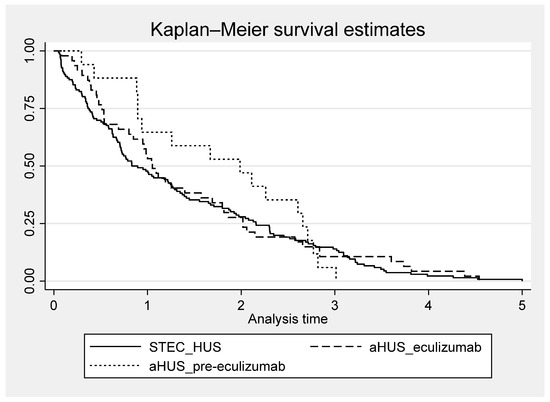 After a 1-year follow-up, the majority of patients had recovered, with normal kidney function, blood pressure, and albumin/protein excretion achieved in 68% of children with STEC-HUS, 55% of those with aHUS in the pre-eculizumab group and 82% of those with aHUS in the eculizumab group. At the 5-year follow-up, 69% of patients with STEC-HUS, 43% with aHUS treated before 2018, and 63% with aHUS in the eculizumab cohort achieved full recovery. Time to recovery from the onset of the disease was longer for the aHUS pre-eculizumab cohort compared to the aHUS eculizumab cohort and the STEC-HUS group (Figure 6). Among just those who recovered, 50% of children with either STEC-HUS or aHUS in the eculizumab group achieved had full recovery by 1-year follow-up, and 75% had fully recovered by the 2-year follow-up. However, the time to recovery for the remaining 25% continued to extend up to 5 years. A total of 50% of those who recovered in the pre-eculizumab aHUS group achieved full recovery by the 2-year follow-up.