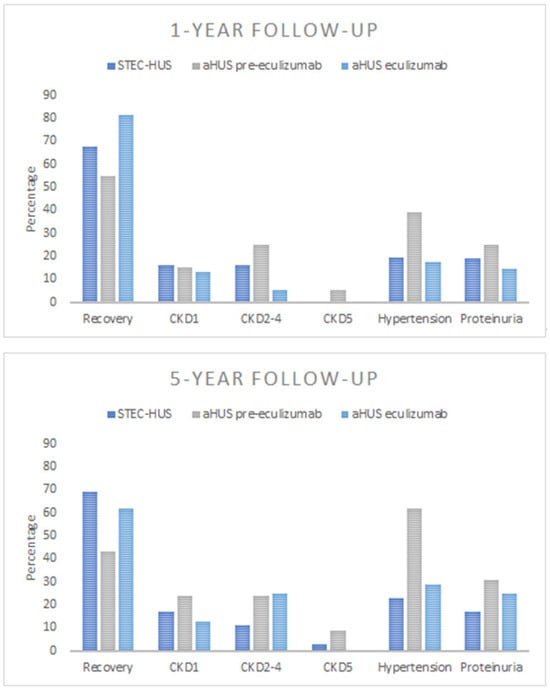 At the 1-year and 5-year follow-ups, 32% and 31% of STEC-HUS patients, respectively, exhibited kidney sequelae indicating acute kidney injury during the course of HUS. Of the STEC-HUS patients at the 1-year follow-up, 16% had CKD1, 16% developed CKD2-4, but none required kidney replacement therapy. At the 5-year follow-up in the STEC-HUS group, 17% had developed CKD1, 11% had CKD2-4, and 3% were on maintenance dialysis. For aHUS patients, outcomes varied by treatment group. At the 1-year and 5-year follow-ups, 45% and 57% of the pre-eculizumab group developed CKD: CKD1 in 15% and 24%, CKD2-4 in 25% and 24%, and CKD5 in 5% and 9%, respectively. The eculizumab group fared better at the 1-year and 5-year follow-ups, with 18% and 37% classified as CKD: 13% and 12% as CKD1, and 5% and 25% as CKD2-4, respectively. No child in the eculizumab group required maintenance kidney replacement therapy (Figure 7). After 1 year and 5 years from onset, proteinuria was present in 19% and 17% of the STEC-HUS group, 25% and 31% of aHUS patients treated in the pre-eculizumab era, and 15% and 25% of the aHUS eculizumab group, respectively. During the 5-year observation period, the percentage of hypertensive children decreased from 48.5% at onset to 23% for STEC-HUS patients, remained unchanged for the pre-eculizumab aHUS group (60% vs. 62%), and decreased from 60% to 25% for the aHUS eculizumab group. According to the Polish RRT Registry, a total of 14 patients with HUS started KRT during 2012–2022, out of 360 patients with CKD5 due to other causes. This number included 11 patients with aHUS, and 3 with STEC-HUS. Seven out of the eleven children with aHUS started maintenance dialysis within the first 6 months (the median time for the eleven patients was 0.002 years, IQR 0.002–0.42) from the initial manifestation of the disease. No child with aHUS developed CKD5 after the introduction of anti-C5 therapy. Children with STEC-HUS progressed to CKD5 at a median time of 9.8 years after onset. No child with STEC-HUS has been reported to have CKD5 since 2018.