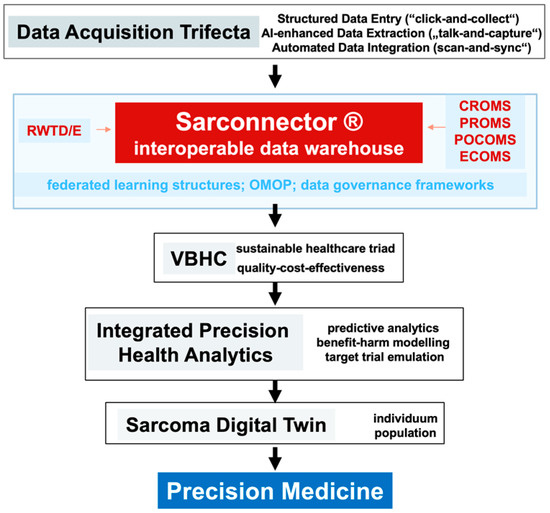 The graphical abstract illustrates the integration of structured and harmonized data into the Sarconnector Interoperable Data Warehouse, which supports value-based healthcare (VBHC) in sarcoma care. Real-world-time data acquisition, including clinician-reported outcomes (CROMS), patient-reported outcomes (PROMS), economic measures (ECOMS), and omics data (PCOMS), feeds into predictive analytics and the Sarcoma Digital Twin. This system facilitates precision medicine by enabling individualized, evidence-based care while optimizing clinical outcomes and cost-effectiveness.